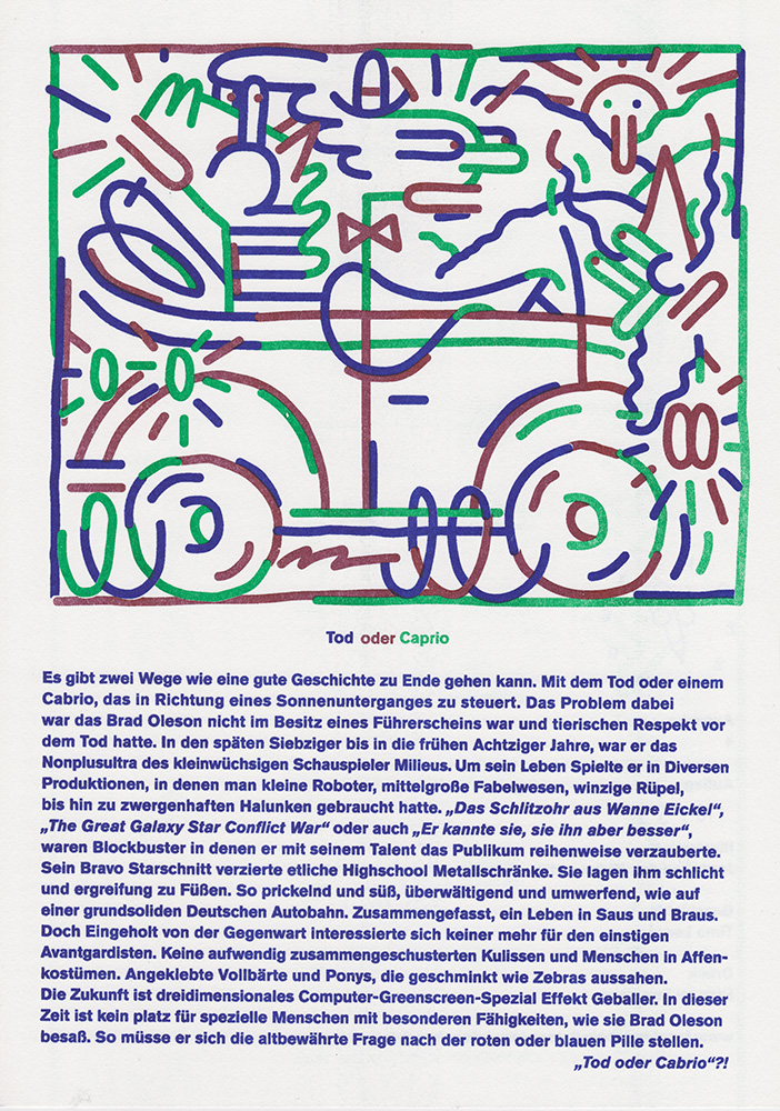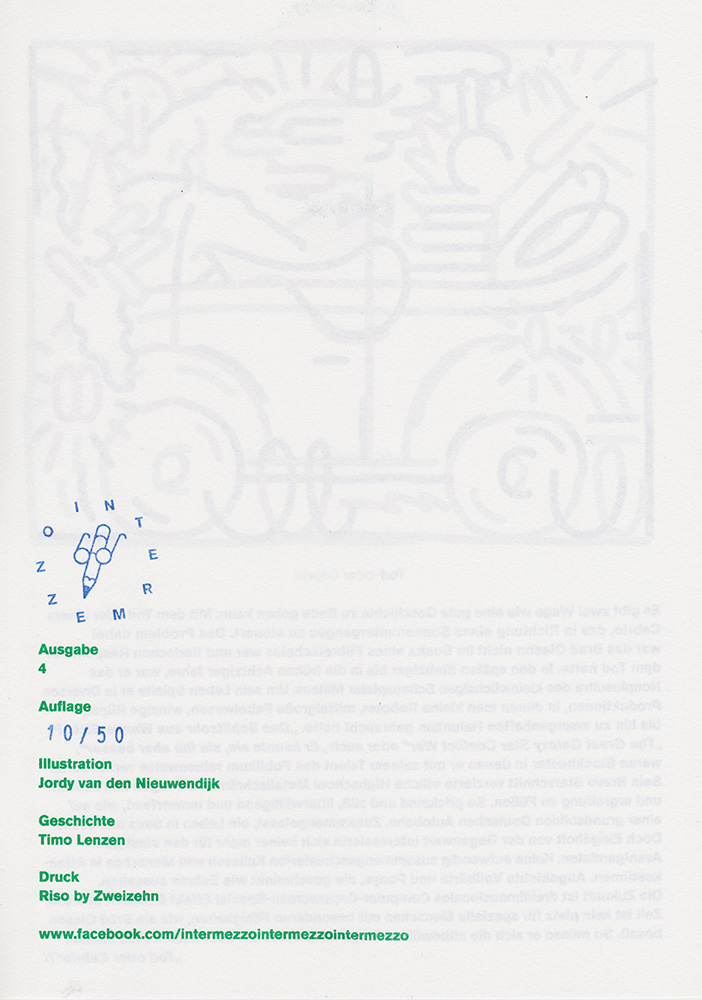 Timo Lenzen invites artists to make drawings for his charming and well written short stories. Every four weeks a new Intermezzo appears as a limited (50 pcs.) A4 sized Risograph publication, printed by Zweizehn.